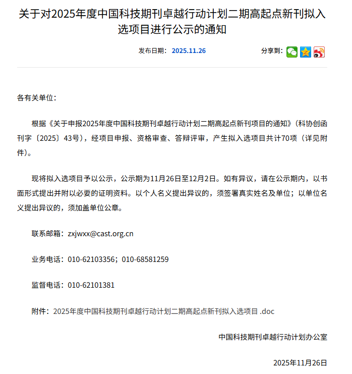 近日,中国科技期刊卓越行动计划办公室印发《关于对2025年度中国科技期刊卓越行动计划二期高起点新刊拟入选项目进行公示的通知》,通知指出经项目申报、资格审查、答辩评审,产生拟入选项目共计70项。其中,91热爆