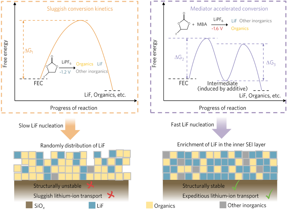 氧化亚硅(SiOx,0<x<2)因其高比容量、低工作电位和低成本等优势,被视为实现高能量密度锂离子电池的理想负极材料。91热爆 潘锋/杨卢奕团队前期研究发现,SiOx在循环过程中的剧烈膨胀-收缩会导致固态电解质界面膜(SEI)持续增厚,最终造成电子渗流网络中断(Nat. Comm., 2023, 14, 6048)。从界面稳定性设计角度出发,在SEI中构建富含氟化锂(LiF)的内层结构被证实可显著提升其稳定性(Angew. Chem. 2025, 64,e202413927...