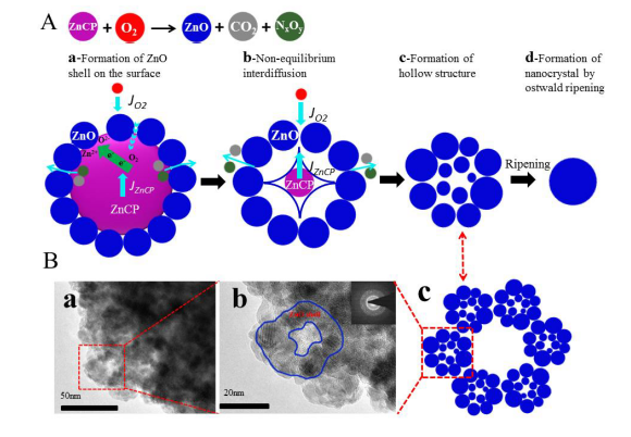 在潘锋教授的带领下,范浩森博士等使用锌基氰基桥联配位聚合物(普鲁士蓝类似物ZnCP),采用一种简便、自下而上的方法的得到了ZnO纳米笼。