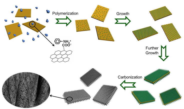 潘锋教授、徐坚研究员(中科院化学所)和博士后范浩森博士实现了在石墨烯表面长出了多孔三维氮参杂碳纳米棒的设想,使用的原料为碳化聚苯胺和氧化石墨烯。