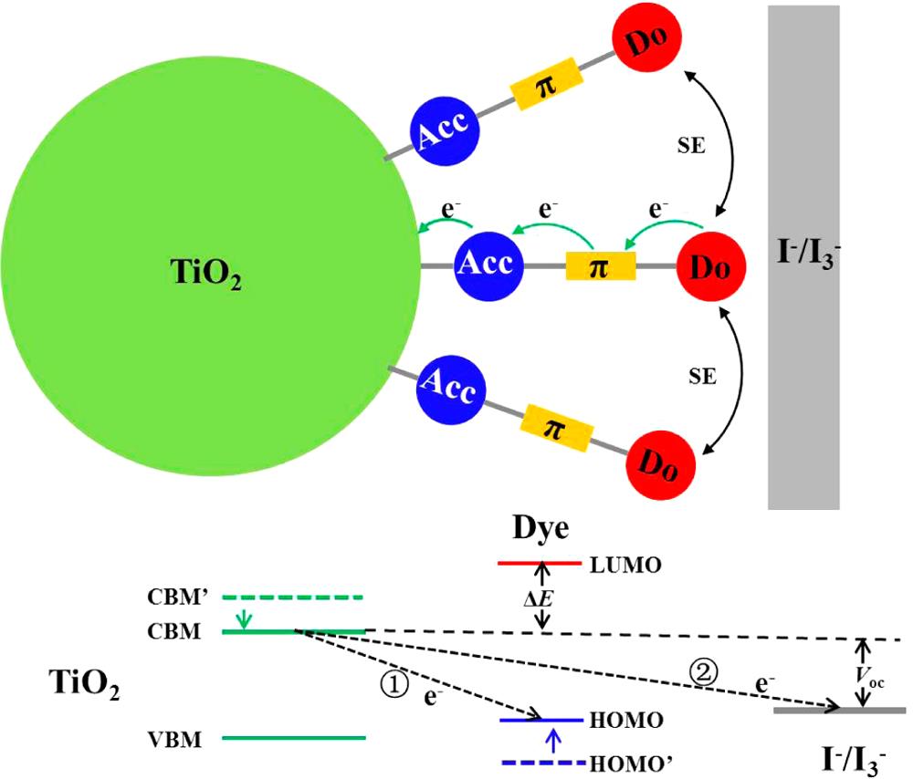 潘锋教授团队与香港城市大学Man Shing Wong教授团队、中科院化学所林原教授团队合作,通过第一性原理和实验发现,当染料分子吸附在TiO2的表面上以后,界面存在显著的电荷转移,而且这种电荷