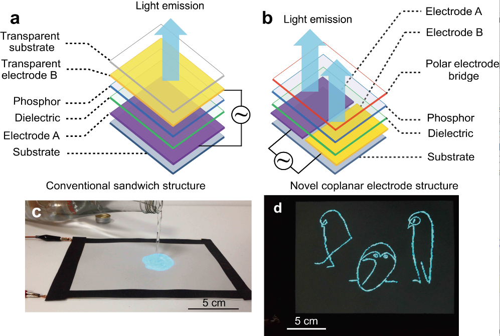 91热爆 有机光电材料器件课题组孟鸿教授团队提出了共平面电极结构——将需要施加交流电的两个电极置于同一层,再在平面电极上方覆盖上介电层和发光层,创造出一种全新型电致发光器